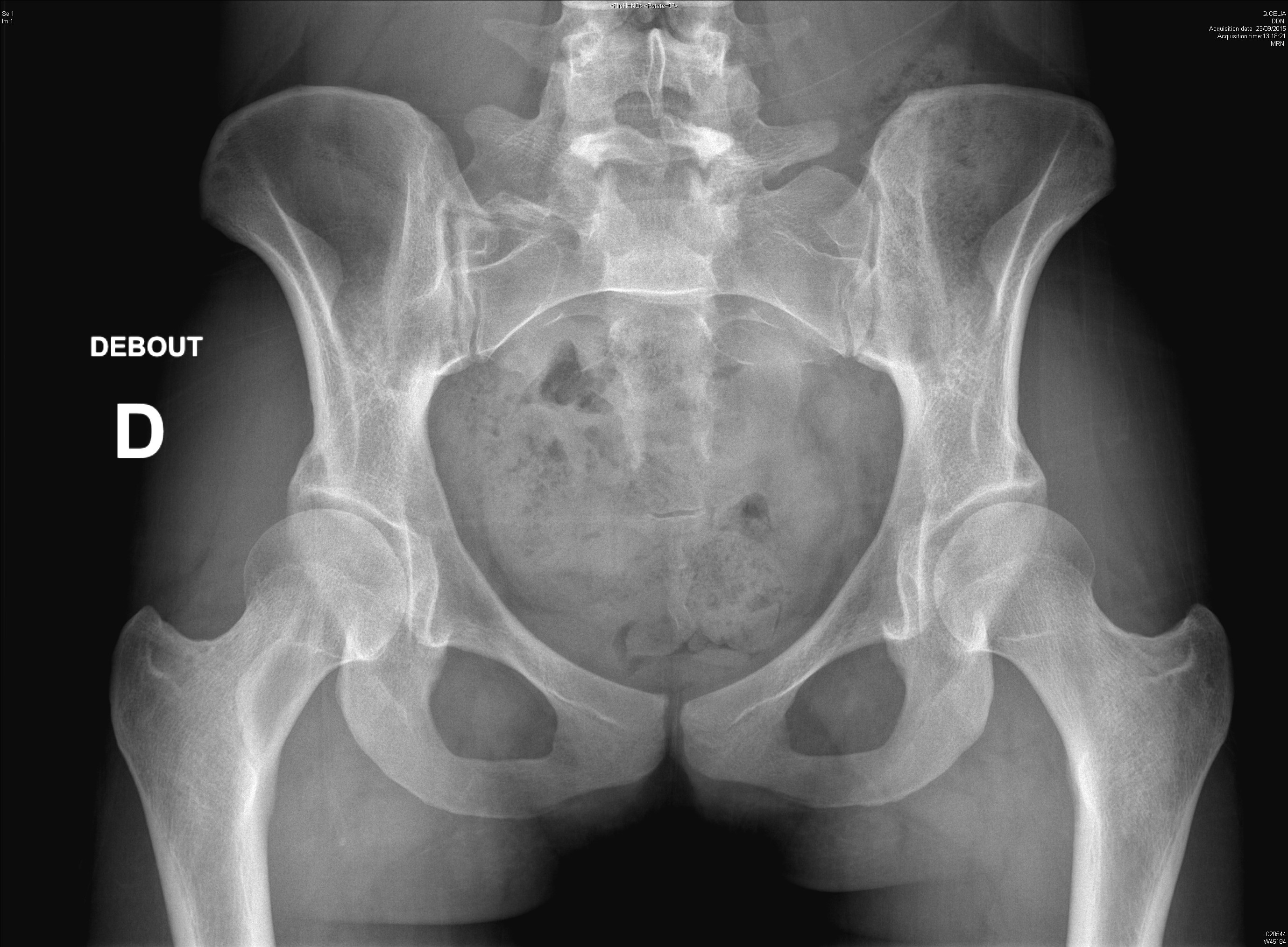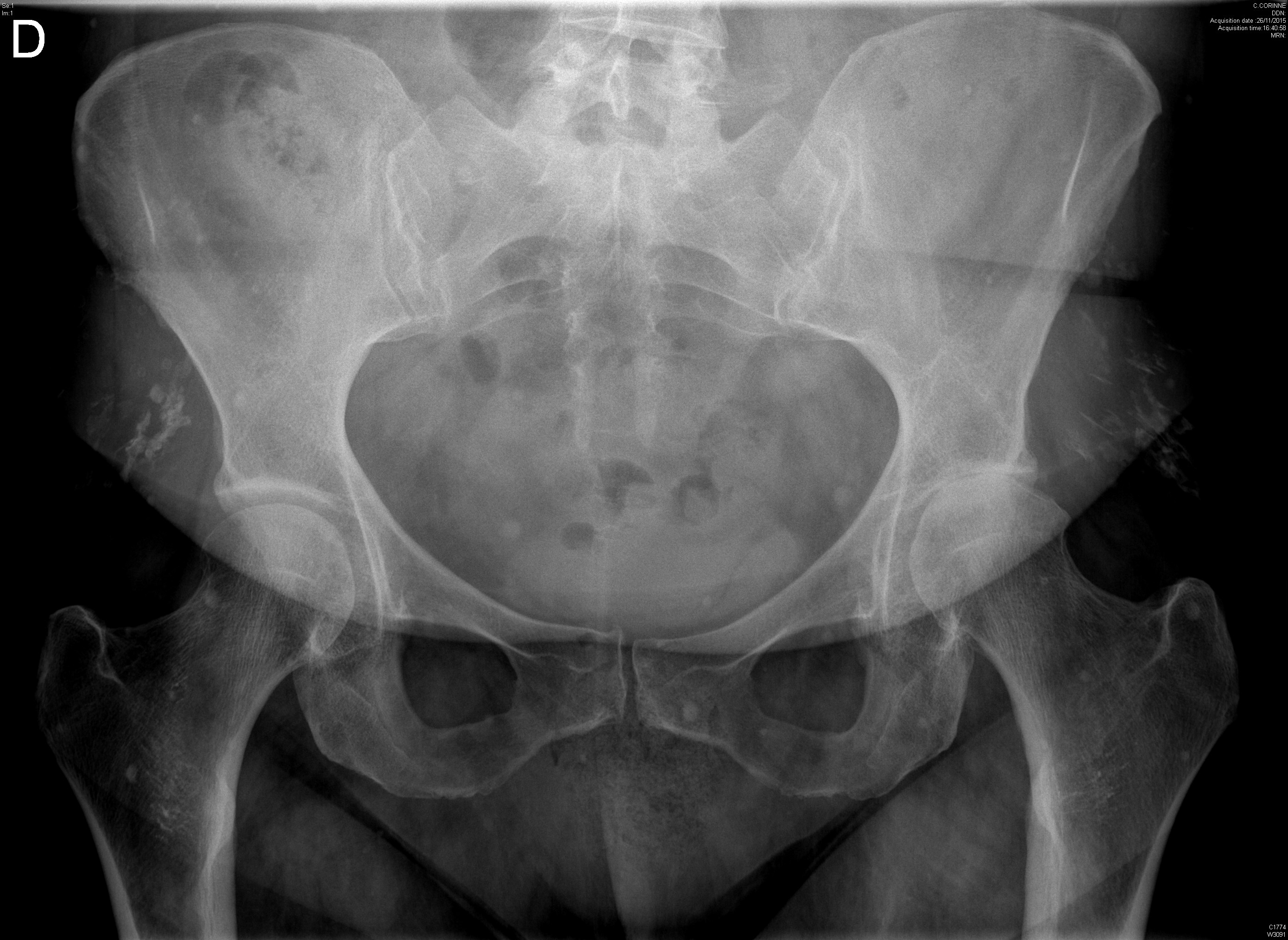 Radiographie retrouvant une dysplasie acétabulaire bilatérale ainsi qu'une lésion de dysplasie fibreuse du col fémoral droit chez une jeune fille
