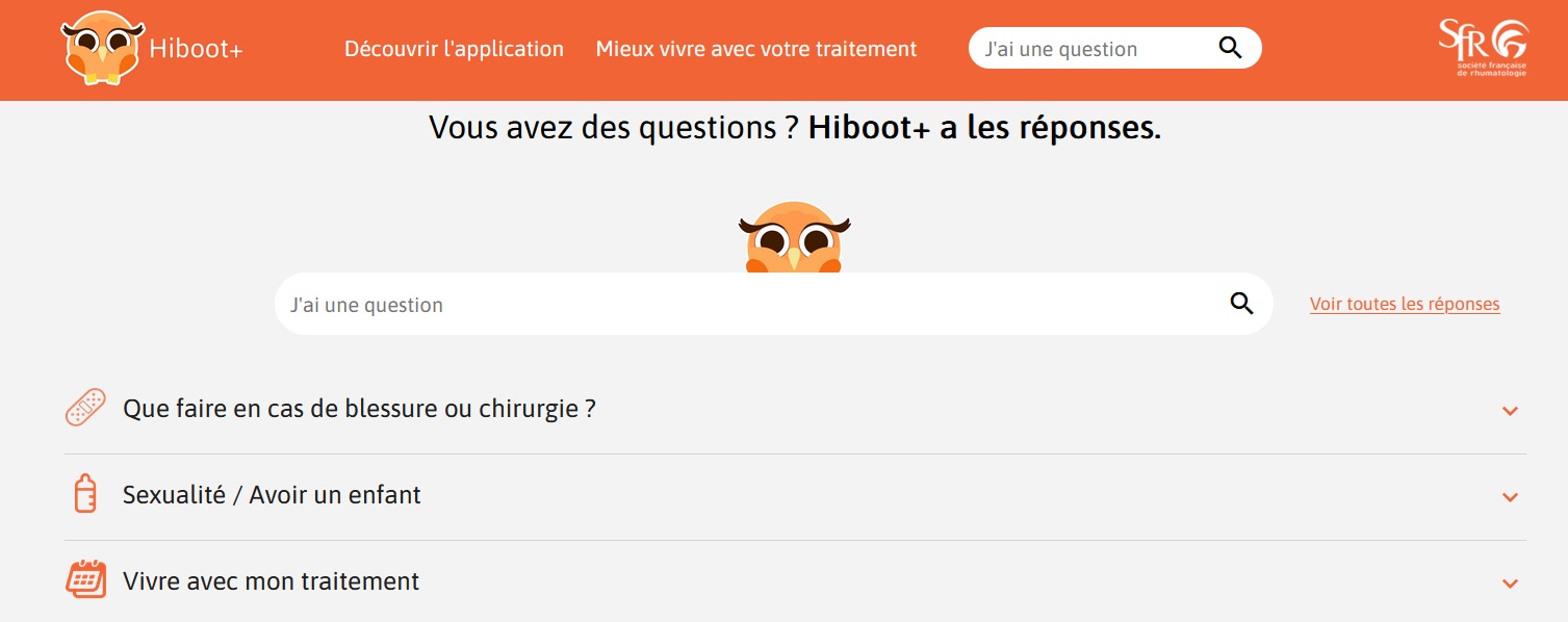 Hiboot+ est votre compagnon au quotidien pour le méthotrexate, les biomédicaments et les Inhibiteurs de JAK ! Cette application gratuite peut être téléchargée sur votre portable. Elle a été développée avec la Société Française de Rhumatologie.