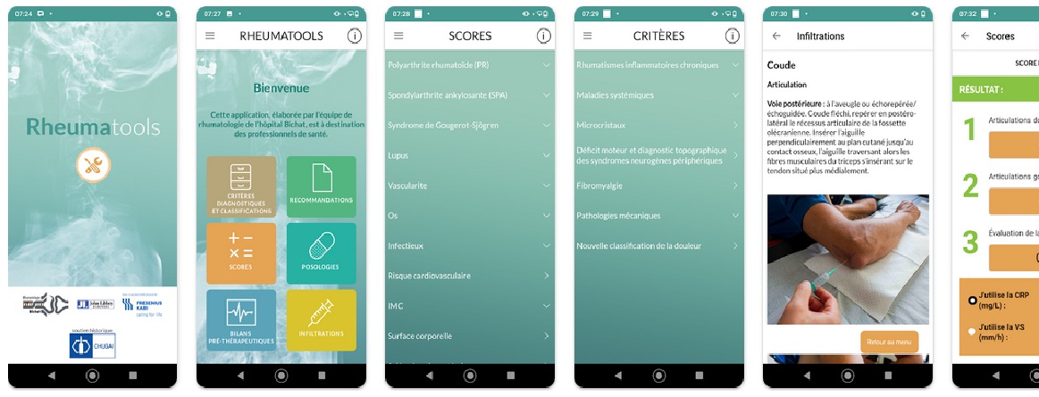 Rheumatools est un outil qui vous accompagne dans les différentes étapes de la prise en charge de votre patient. Divisée en six rubriques très complète, elle propose des outils indispensables : scores interactifs, fiches pratiques, tableaux récapitulatifs, recommandations mises à jour, photos et critères diagnostic par pathologie. Cette application médicale est à destination des professionnels de santé prenant en charge les maladies ostéo-articulaires ainsi que les maladies systémiques.